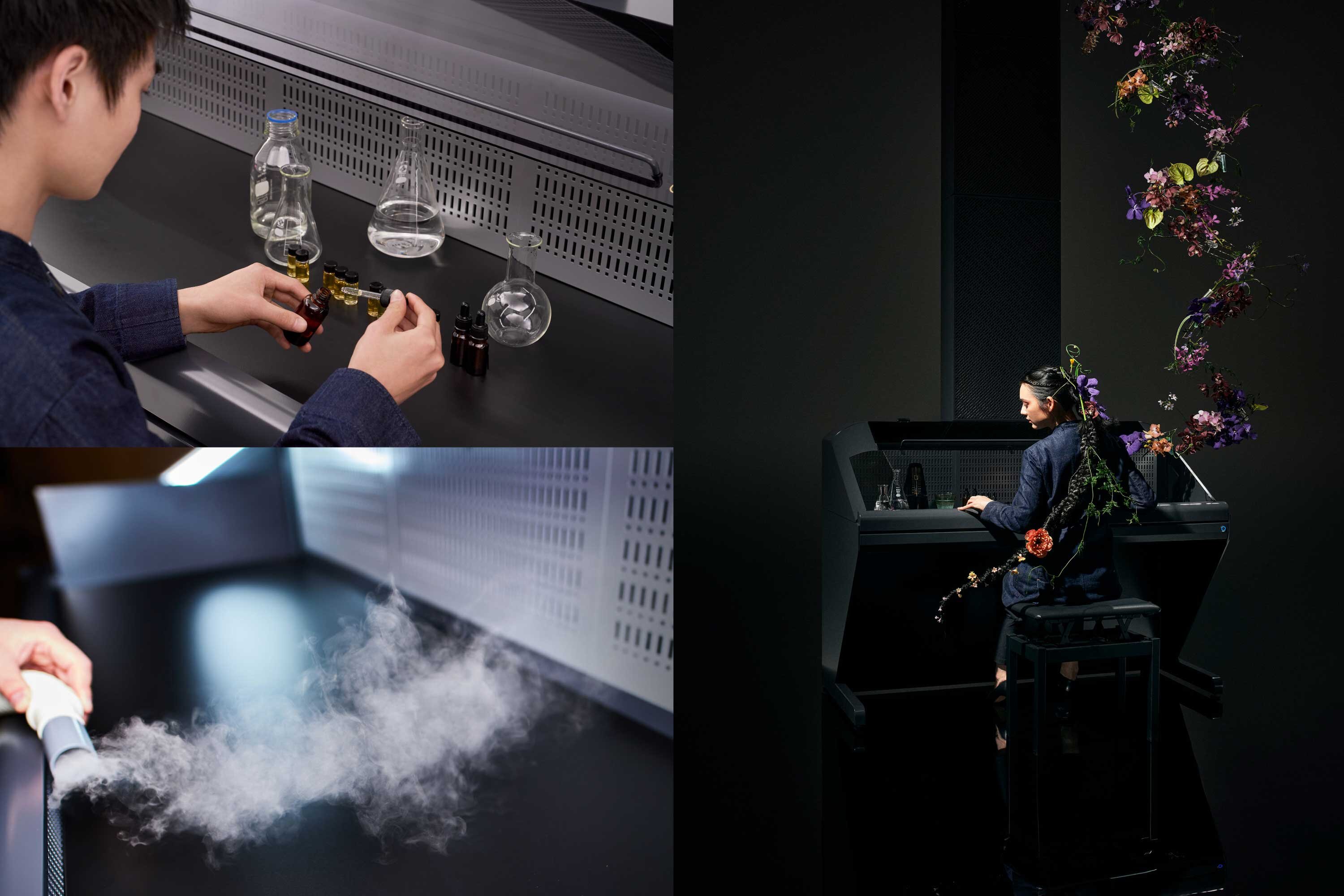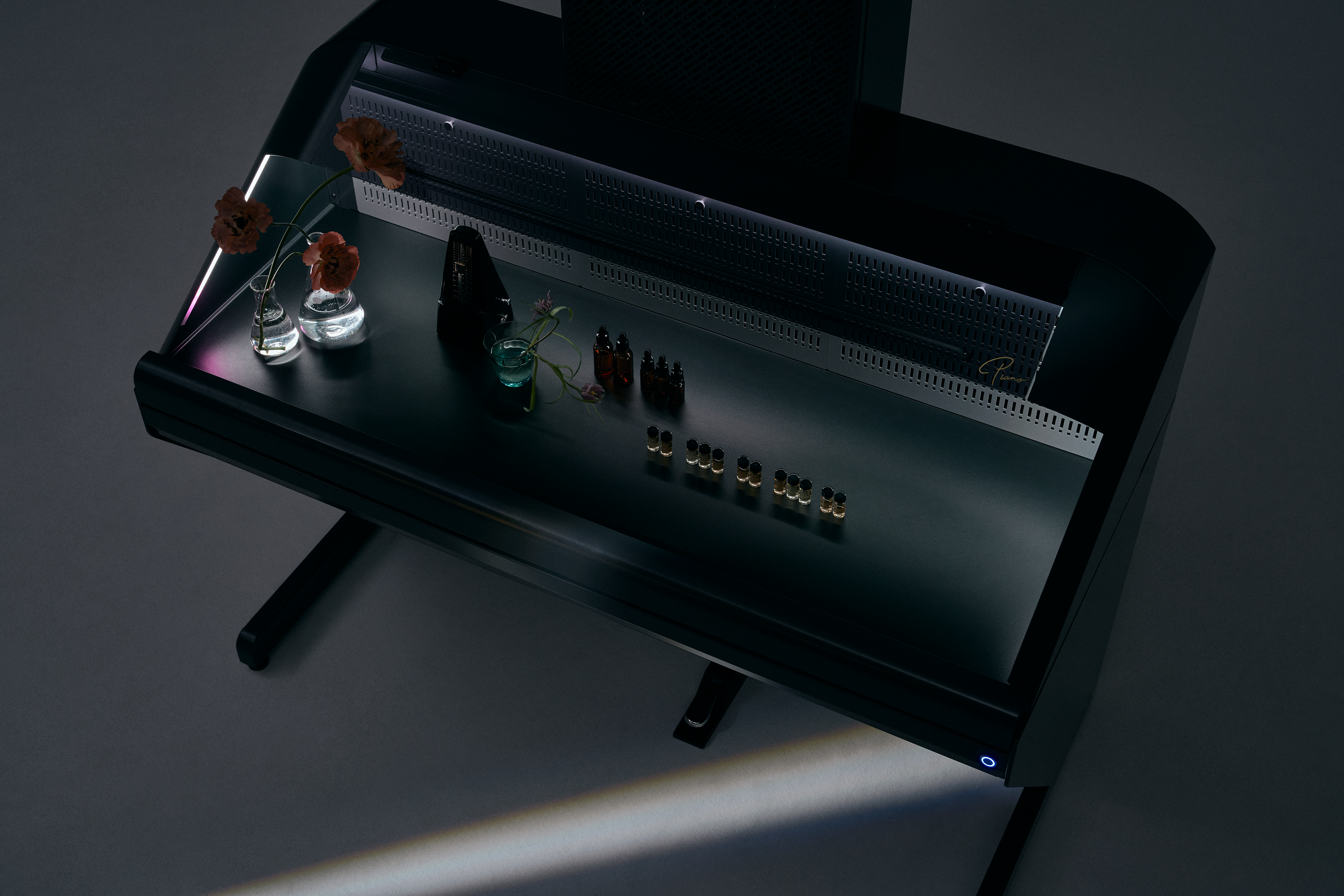 ところでこの製品のデザインを考える際、「ここに座ったとき、まるでピアノを演奏するアーティストのように作業できたらすごく美しいシーンになるんじゃないか」というアイデアがふと頭に浮かびました。インクや香料を扱うラボの仕事は、化粧品開発など美的感覚と強く紐づくものが多々あるので、無機質なラボ然としたプロダクトではなく、もっと感性的なものにできたらと思ったのです。ちょうどサイズ感もアップライトピアノと同じくらいですし、それなら思い切ってピアノを模したデザインにしてしまおう、と。