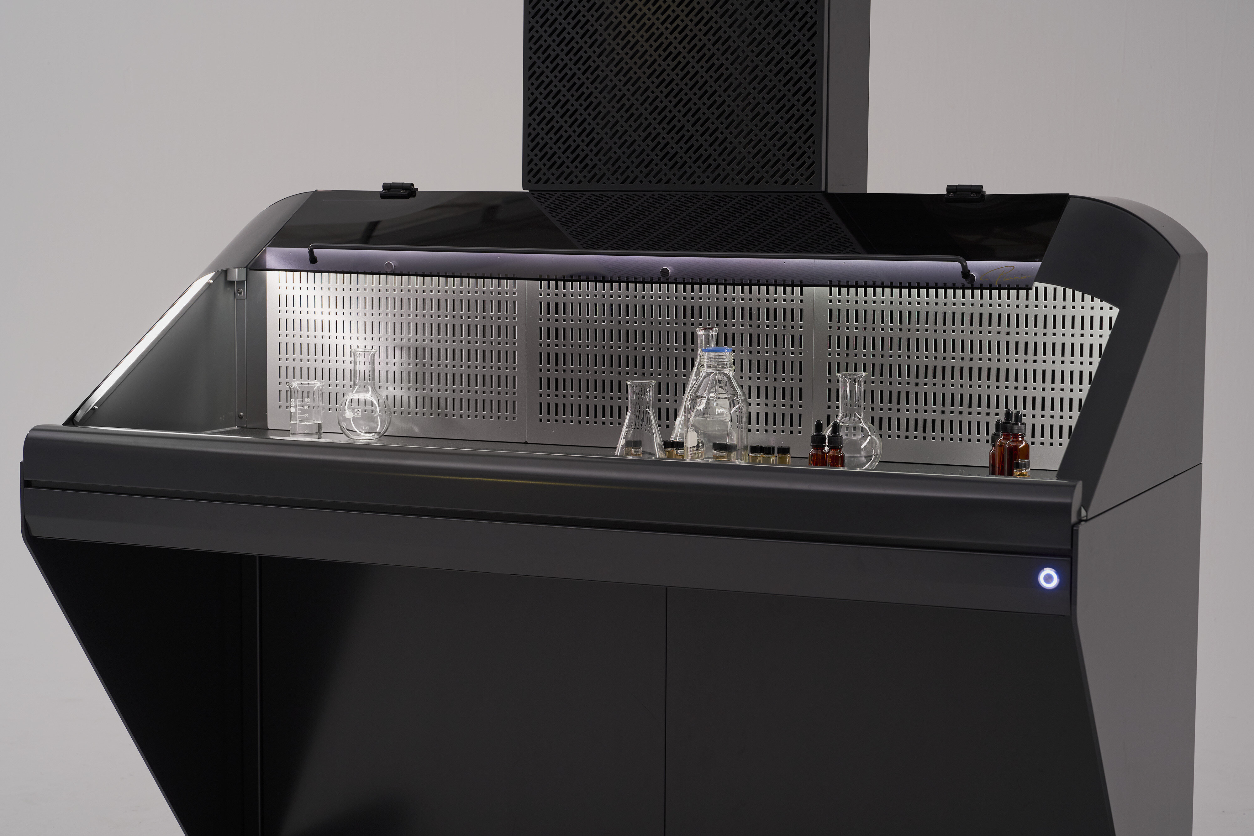 当初はインクを扱うメーカー様向けに開発しましたが、実際に商品化してみると、アロマや化粧品メーカー様など香料を扱うラボのニーズにも応えられることが分かりました。香料同士のにおいが混ざらないように作業したいとき、気流に乗せて効率よくにおいを排気できるからです。コンパクトなサイズ感も、「ヒュームフードほど大げさな装置は不要だけど、ちょっとした作業で使えるものが欲しい」というご要望にフィットしました。