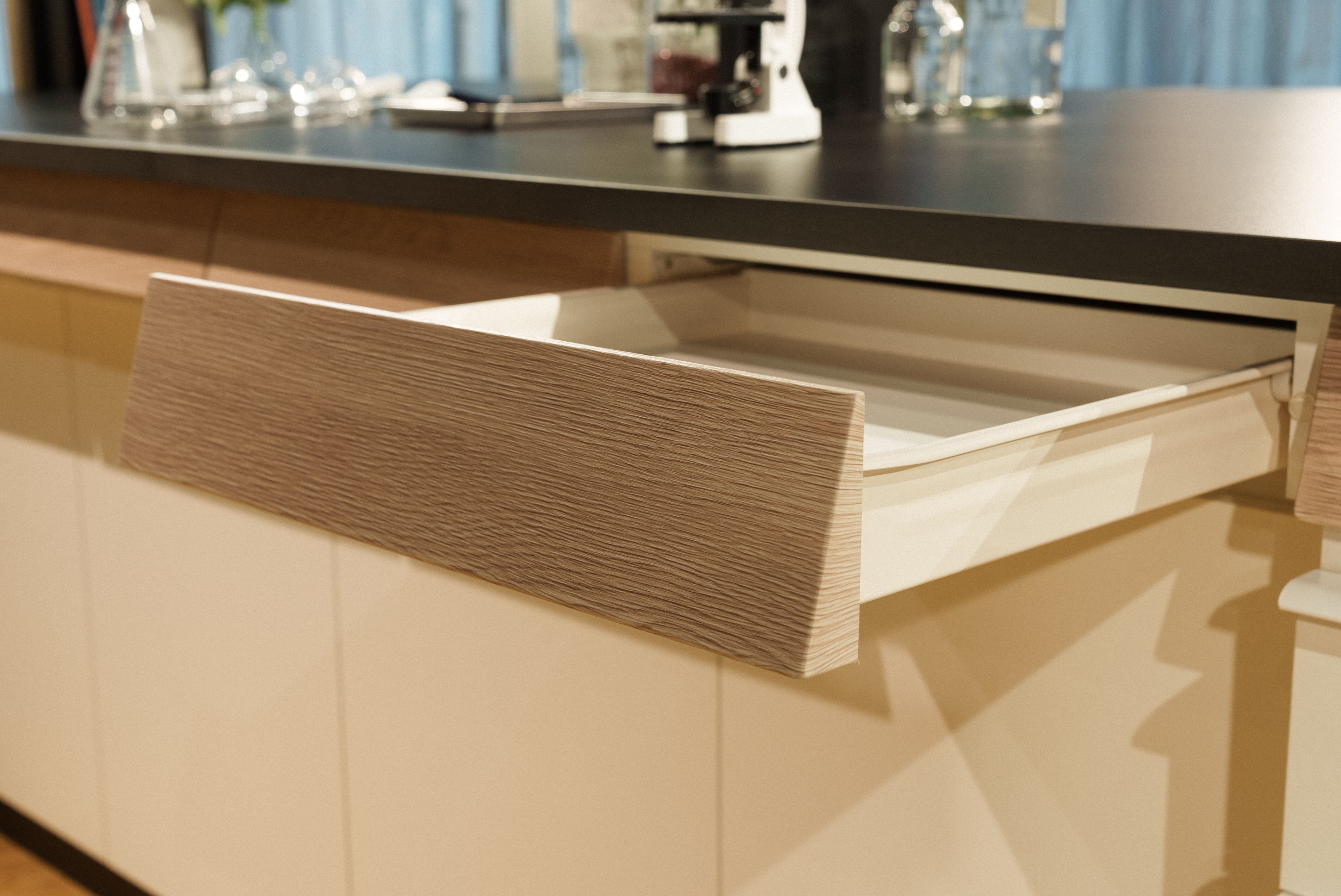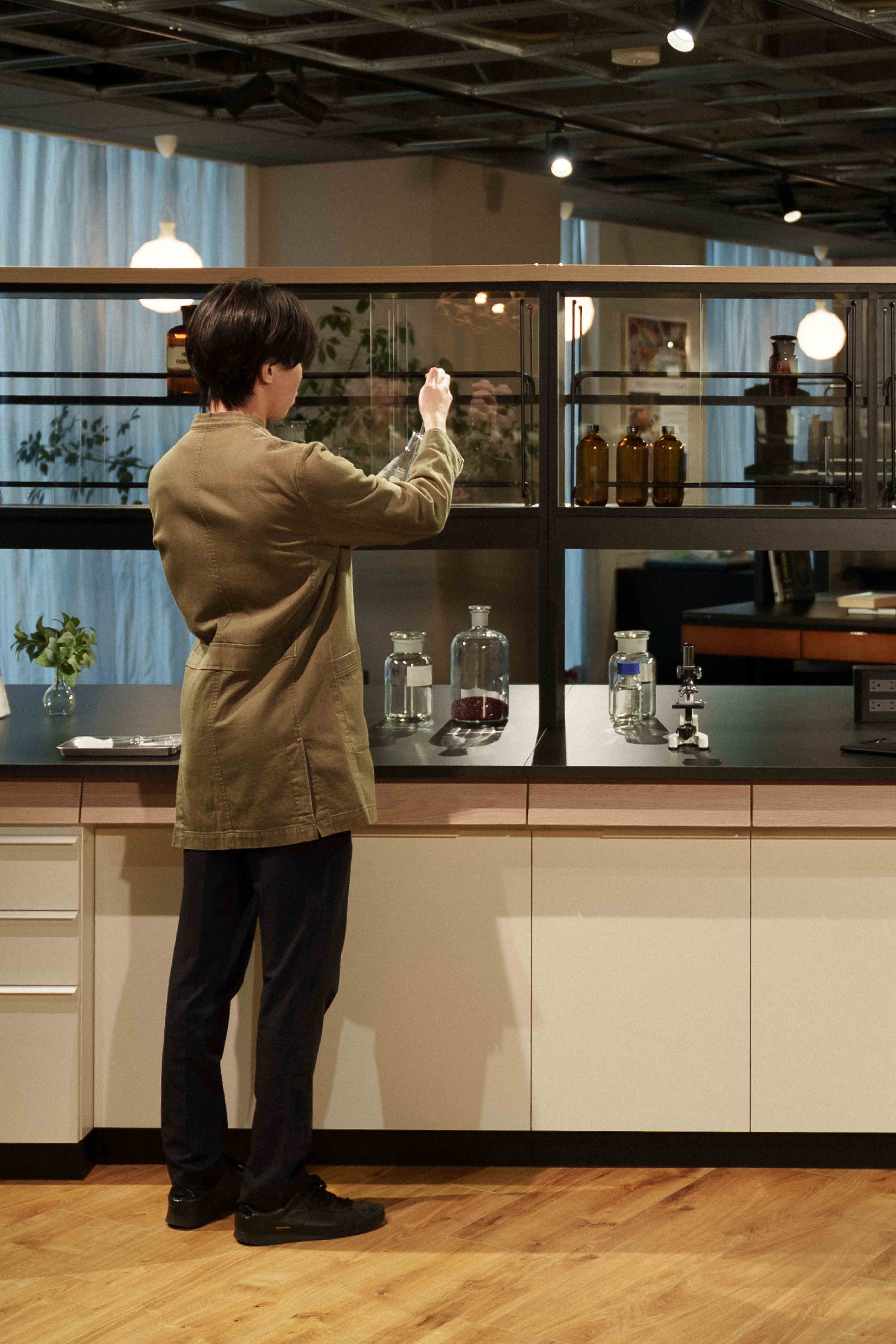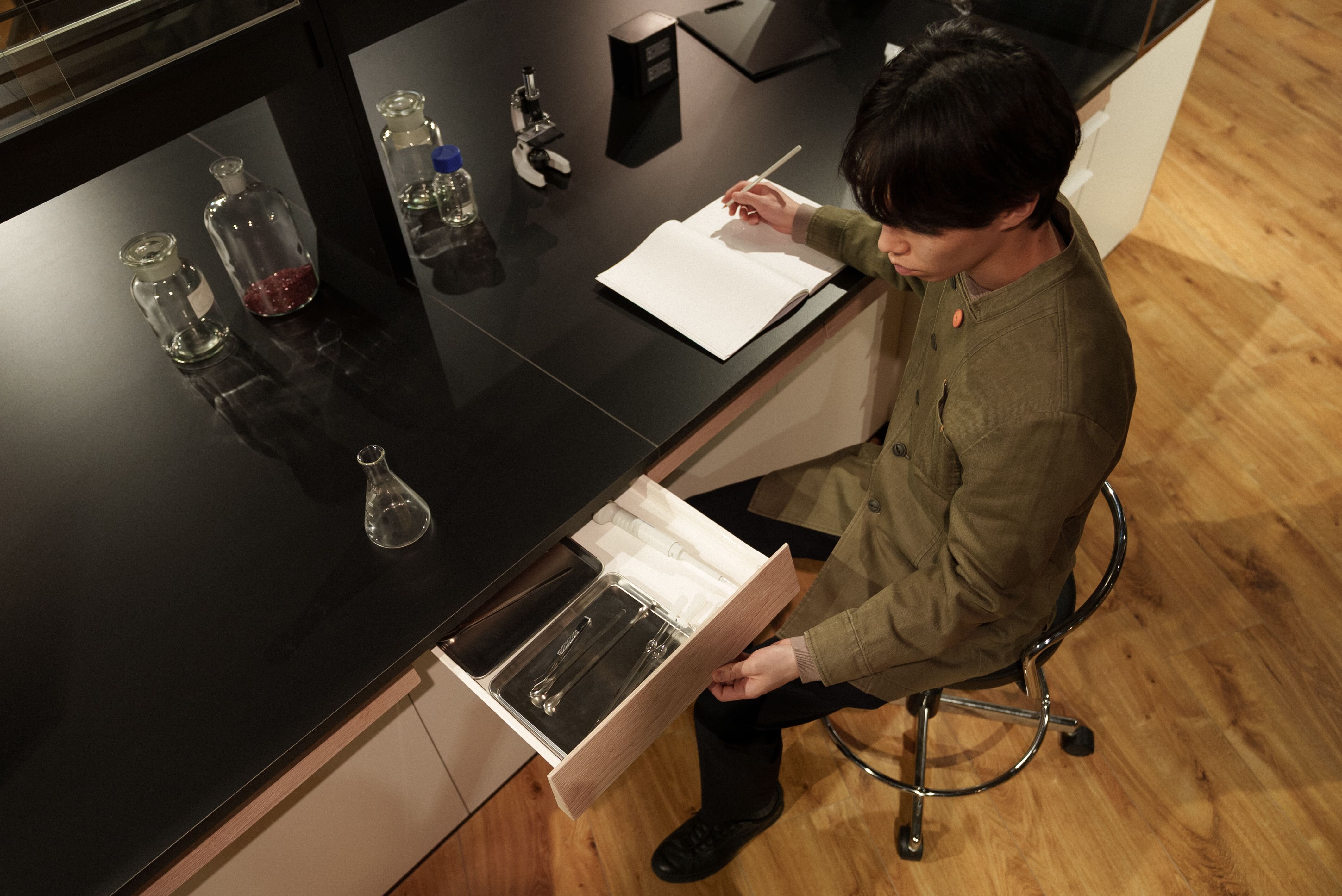 もしその引き出しが開きづらかったら、なんとなく使うことが億劫になってしまう。だから「THE MAN」では、一番上の引き出しの面材部分に傾斜を持たせることで手がかかりやすい設計にしました。開閉もスムーズで、中に薬品や実験器具などを入れるとその重さで安定し、いっそう引き出しやすくなります。